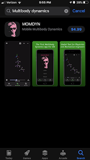 The latest MOMDYN release is on the way, will be in the stores in the next day or so. The universal joint is the newest joint in the app, which creates a frame with rotations about two axes in an Euler sequence. You can see this in the graphic above, which consists of two universal joints, a rigid translation, and two rigid body boxes. Note the large angular displacements where you can observe the relatively slow oscillation about the vertical (Y) axis, and faster oscillation about the horizontal (X) axis.